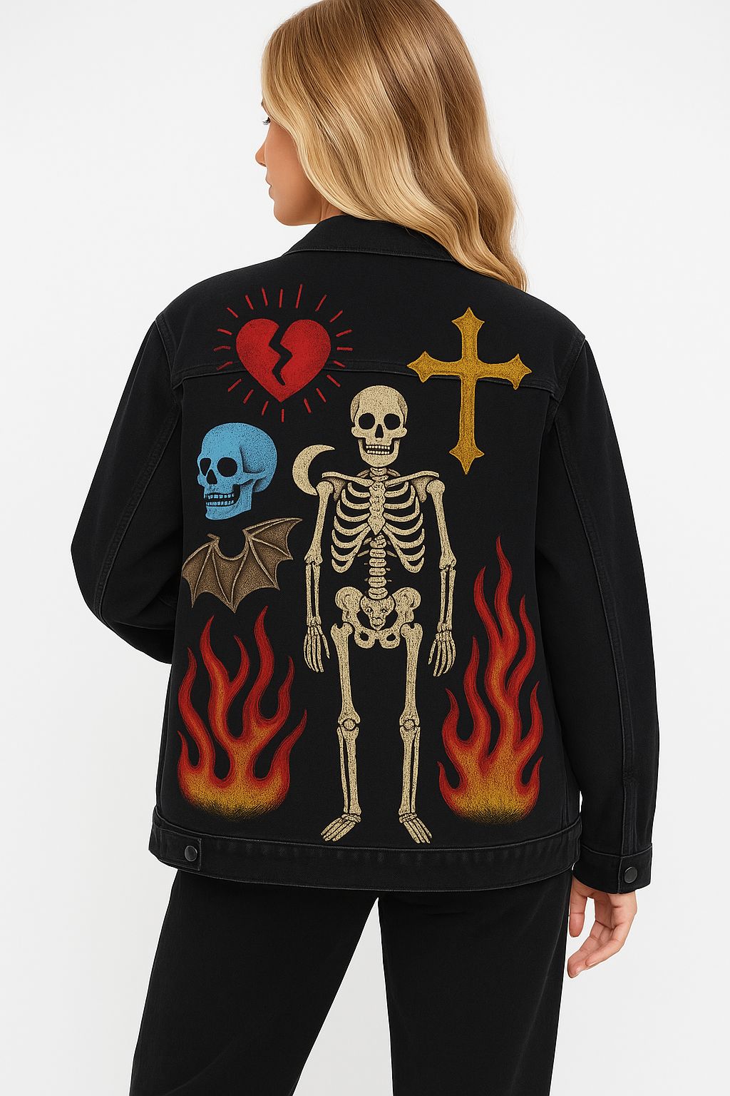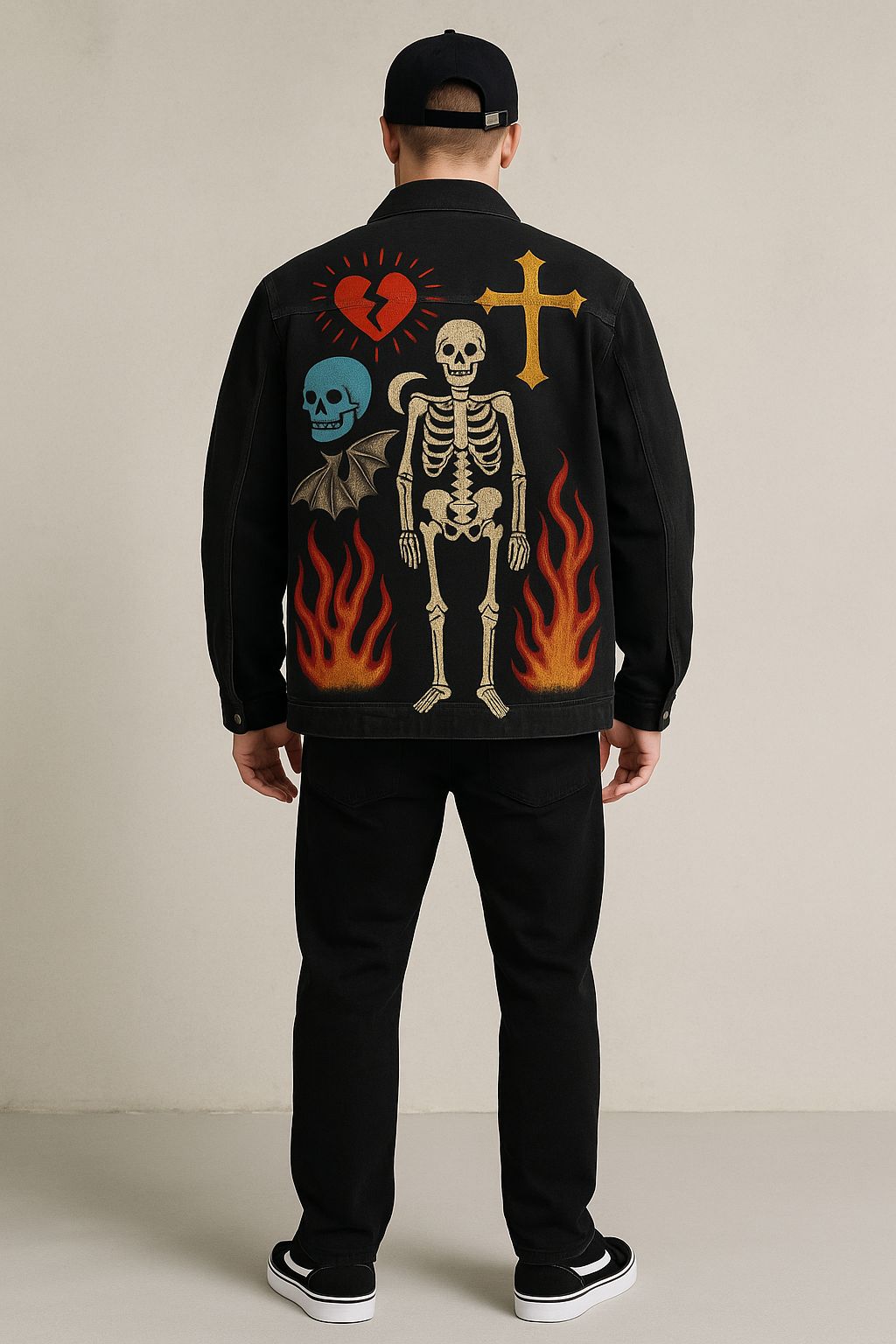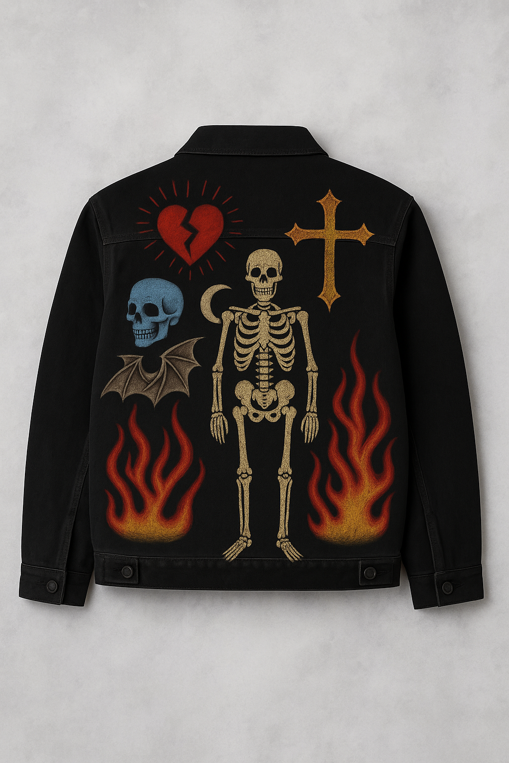 A gothic-streetwear fusion of fire, bone, heartbreak, and divine rebellion.